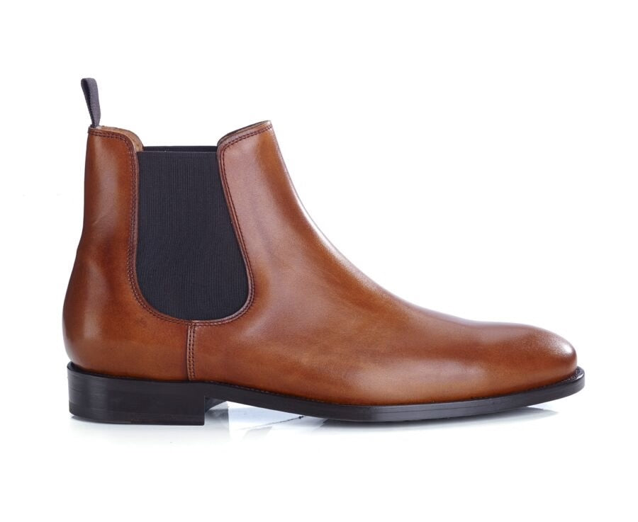 Estos botines Chelsea de piel en un rico color coñac son una adición sofisticada y versátil a cualquier guardarropa. El vibrante tono marrón claro los hace perfectos para combinar con una amplia gama de colores, desde tonos neutros hasta azules marinos y grises. Fabricados con cuero de alta calidad, cuentan con los clásicos paneles elásticos laterales para un ajuste cómodo y un estilo fácil de poner. Ideales tanto para un look casual de fin de semana como para un atuendo de negocios más relajado, estos botines combinan elegancia, comodidad y un toque de personalidad.